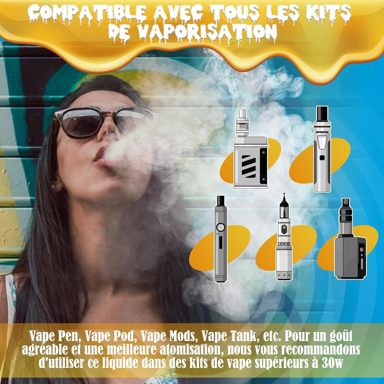 USABLE WITH MOST ELECTRONIC CIGARETTES - This e-cigarette liquid is manufactured to be used in an e-cigarette starter kit, hookah, pod mod set. For the best vaping experience, we recommend using our liquids with a device over 20w.
