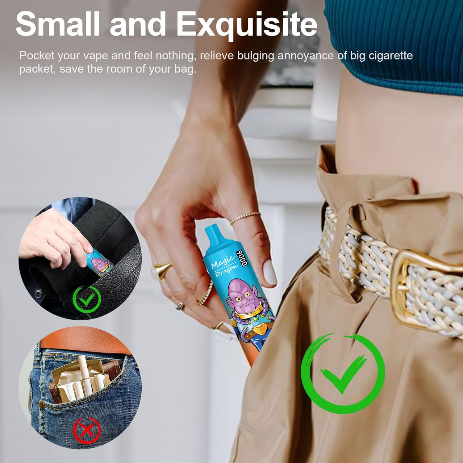 The slogan of Dragon 9000 is max out your taste! When vaping, the six colors LED flashes; The pocket vape is mini and light design, it's easy to carry, you can take it everywhere you go;