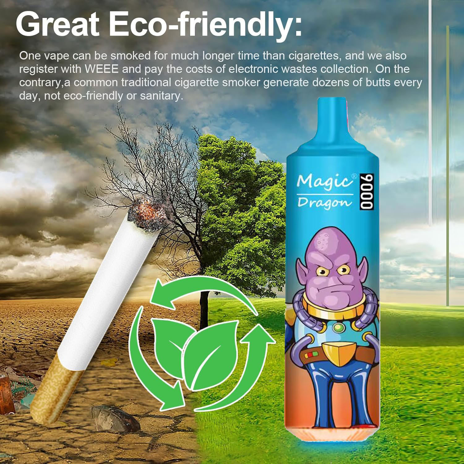 Magic Dragon 9000 Puffs; Battery capacity 650mAh, 18ml e-juice can make it reach to 9000 puffs;